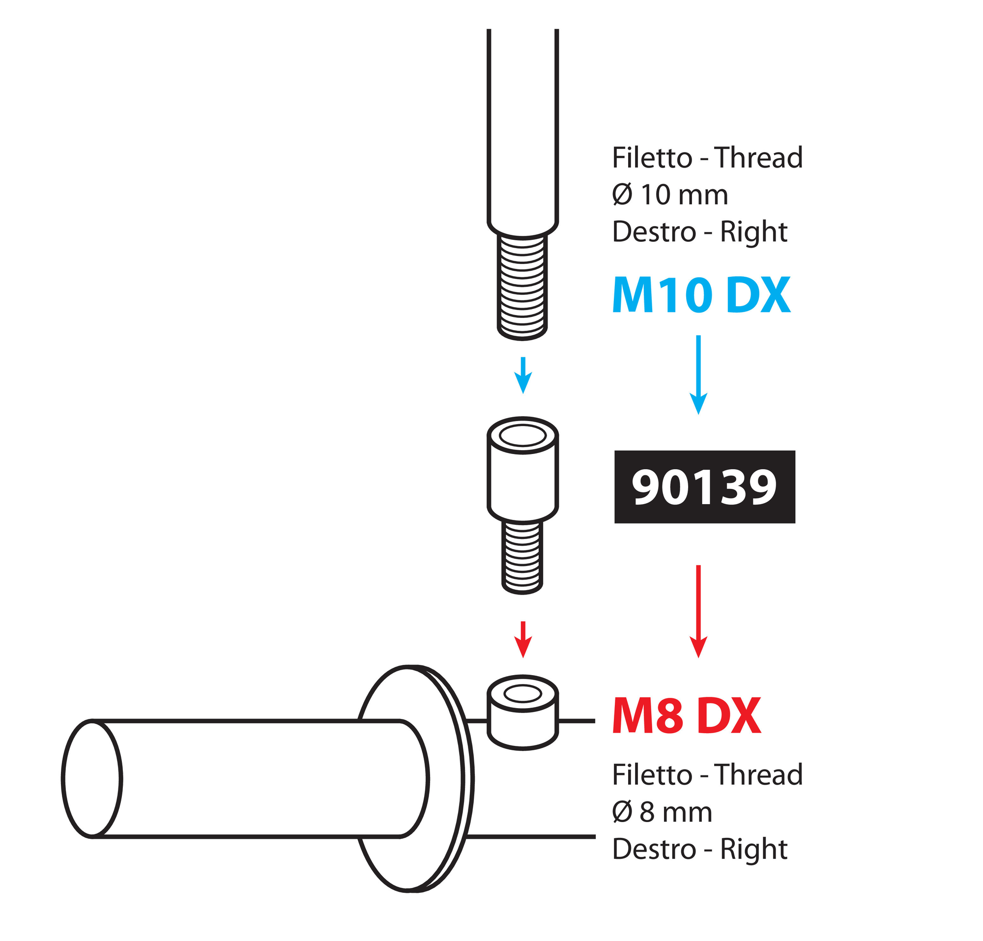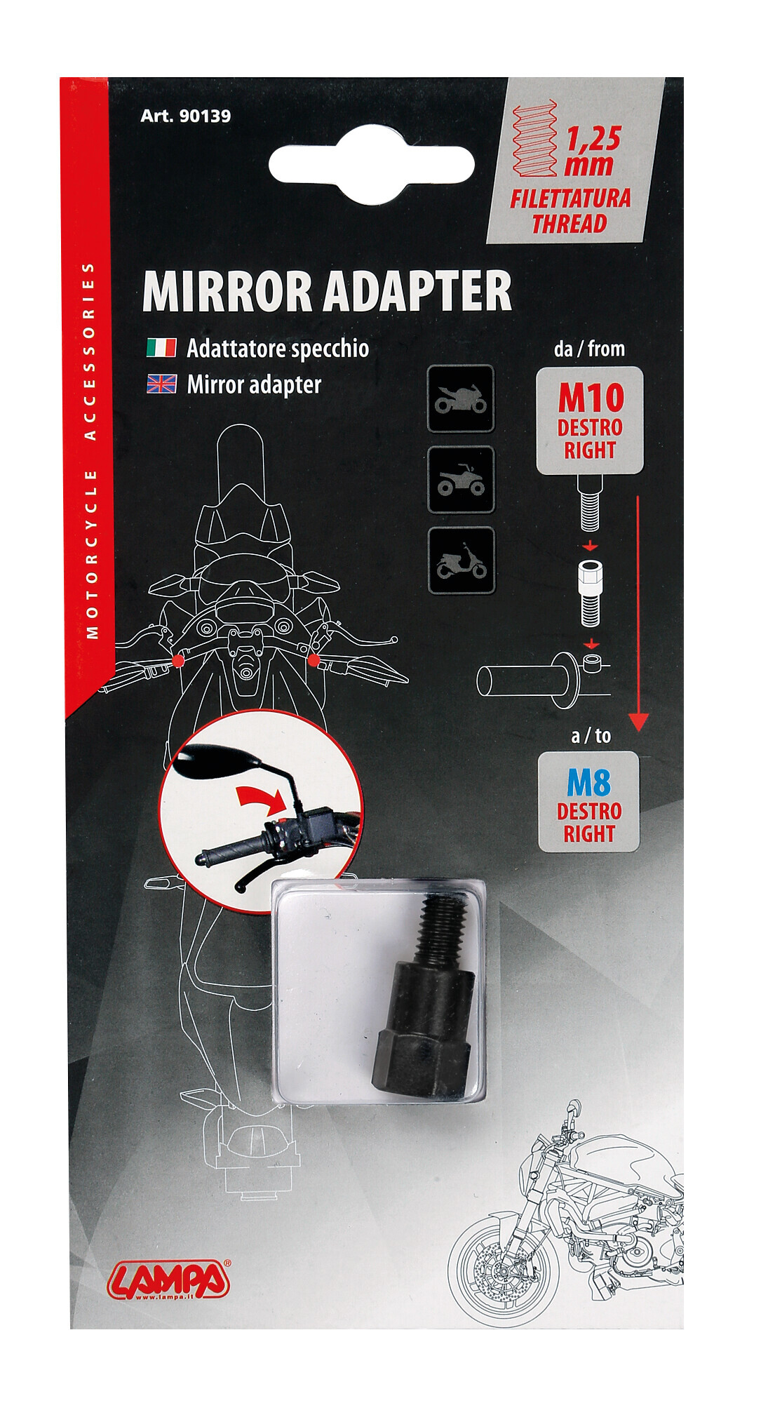- LAMOT90139 , Descriere: Adaptor pentru fixarea oglinzii retrovizoare la motocicleta., De la filet dreapta M10 mm la filet dreapta M8 mm., Pasul filetului 1,25 mm.,