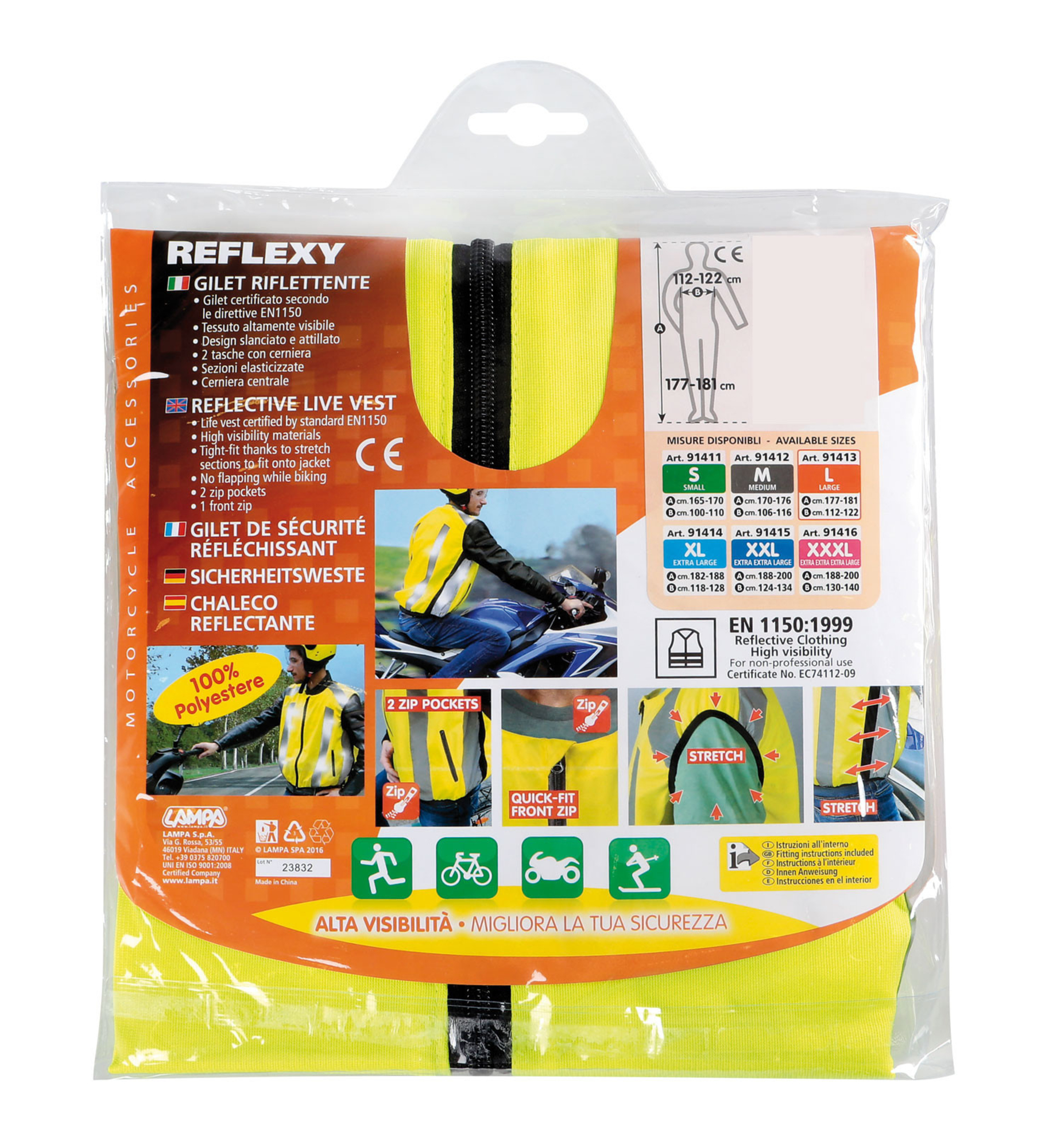 - LAMOT91412 Culoare: Galben, Descriere: Vesta de salvare certificata conform standardului EN1150., Material de inalta vizibilitate cu dungi reflectorizante., Se fixeaza strans pe geaca moto, datorita sectiunilor elastice. Nu flutura in timpul motociclismului sau a ciclismului., 2 buzunare cu fermoar, 1 fermoar frontal., Marime: M, Inaltime 170-176 cm - Piept 106-116 cm,